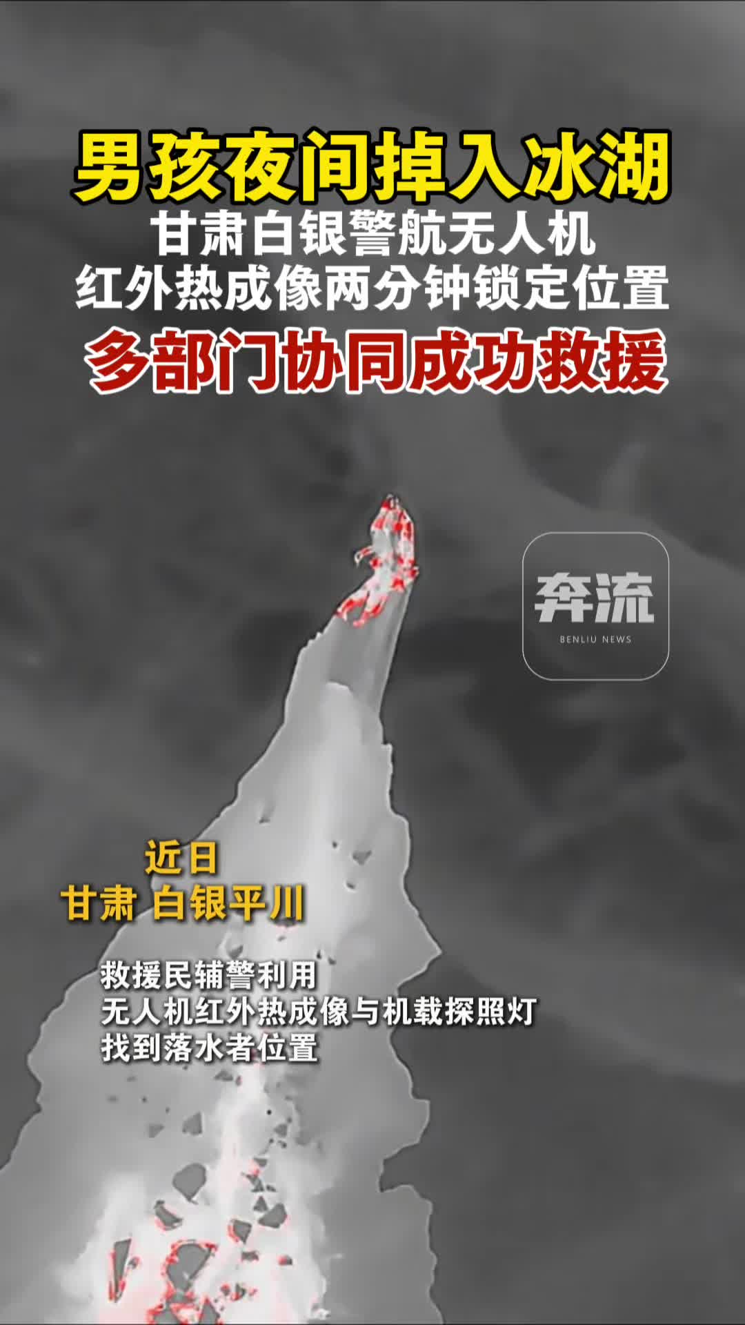 【奔流·视频】男孩夜间掉入冰湖 甘肃白银警航无人机红外热成像2分钟锁定位置 多部门协同成功救援